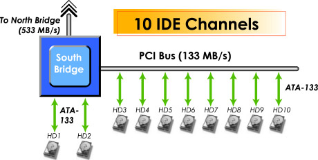 10 IDE ATA 133 Channels in Parallel :