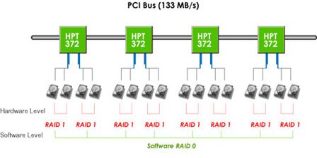 - As illustration, you can use hardware based RAID 1 and software based RAID 0 to construct a RAID 0 + 1 disk array. The advantage is that, when system is running properly, you can enjoy the high performance of multiple hard drives stripped software RAID 0. In case any member of redundant disk array fails, hardware based RAID 1 will immediately take action. System can run as usual. The OS's software RAID 0 will not aware of anything wrong. But hardware RAID 1 will notify system manager via e-mail alert function. Besides, when the failed member of hard drives is replaced, not only the on-lining rebuilding recovery function of hardware RAID 1 will immediately take off but the software RAID 0 can still run as usual.